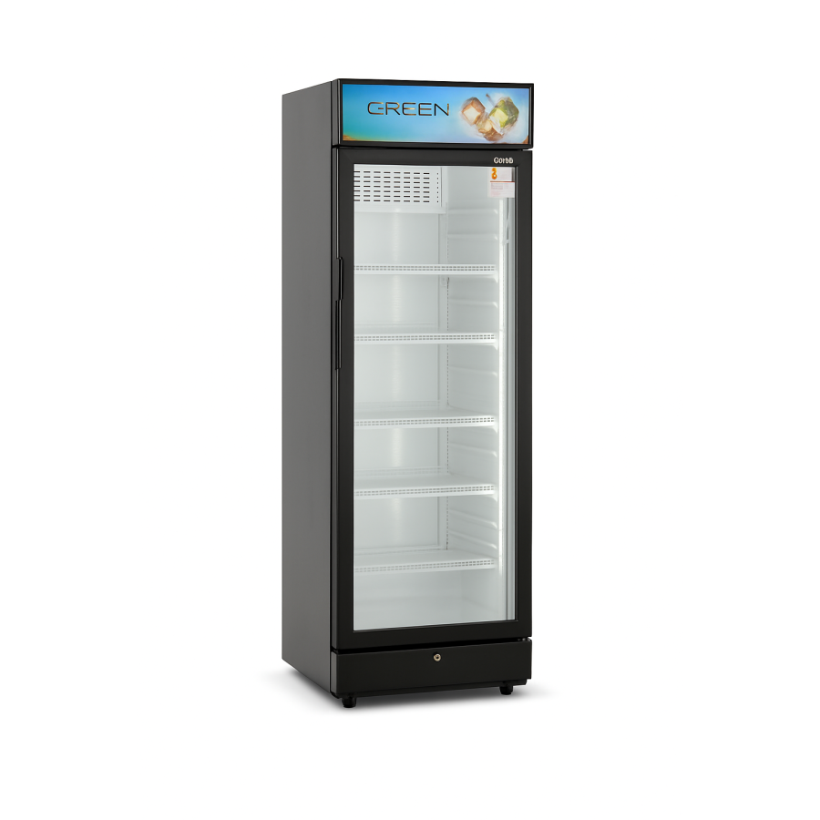 ثلاجة عرض عمودية ( باب زجاجي) مناسبة لعرض المشروبات , العصائر , المياه , و منتجات الالبان باب واحد زجاجي شفاف مع اضاءة علوية 5 رفوف شبكية , تبريد هوائي ( مروحة داخلية لتوزيع البرودة بالتساوي ) متوفر قفل سفلي للامان , لون خارجي اسود مع واجهة امامية زجاجية طول 196 سم , عرض 60 سم