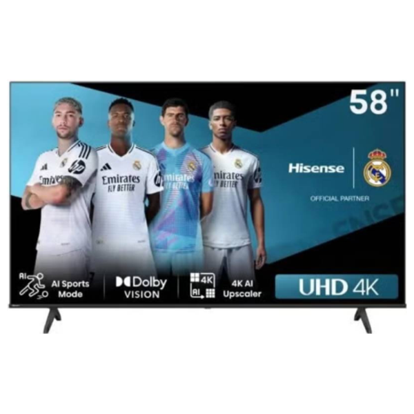 تمتع بتجربة مشاهدة واضحة بجودة 4K UHD مع تلفزيون هايسنس A61 58 إنش الذكي. مزود بدعم Dolby Vision وHDR10 ونظام VIDAA الذكي، يوفر مشاهدة غامرة، وتصميم بدون حواف، وتقنيات ذكية للألعاب والبث، وصوت غني مثالي لوسائل الترفيه المنزلية الحديثة في العراق.